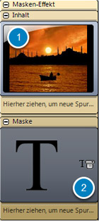 - Nun fügen Sie ein Maskenobjekt hinzu, in das Sie oben ein Bild (1) und darunter ein Textmasken-Objekt (2) einfügen