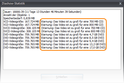 Ein wahres Epos braucht seinen Platz und wenn Sie befürchten, dass ein einziger DVD-Rohling nicht reichen wird, können Sie sich über die Diashow-Statistik vergewissern:
