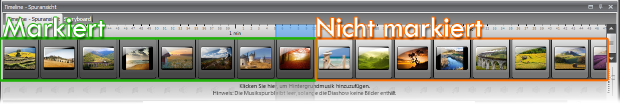 Markieren Sie das erste Bild, halten Sie jetzt die Umschalt-Taste gedrückt und gehen Sie in der Timeline bis zu der Stelle, an der der erste Schnitt gemacht werden soll. Klicken Sie auf das Bild, das zuletzt in Teil 1 Ihrer Diashow angezeigt werden soll.