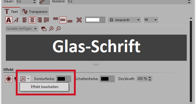 Das obere Textobjekt wird nun angepasst: Über das fx-Symbol wird der Bildeditor ausgewählt.
