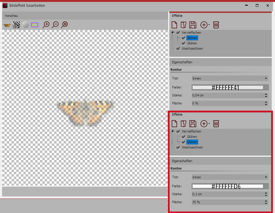 – – Effekt „Glühen“ – Typ=Innen – Farbe=Html-Code #FFFFFF41 – Stärke=0,04 cm – Fläche=0 %