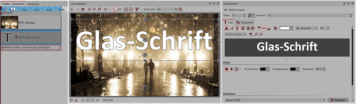 Nun sollte die Gläserne Schrift beim Abspielen korrekt zu sehen sein. Wenn Sie nachträglich noch die Schrift an eine andere Position bringen möchten, nutzen Sie am besten die „Manuelle Eingabe“ (Aufruf mit STRG+M), um über den Wert „Mittelpunkt“ für beide Textobjekt die identische Position herstellen zu können.