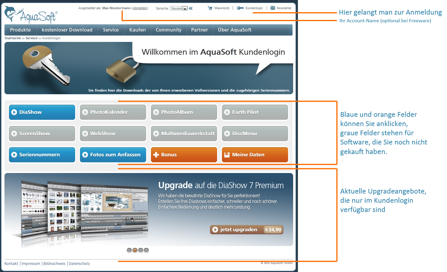 Der Kunde im Beispiel besitzt die DiaShow, deshalb ist dieses Feld blau und er kann es anklicken. Auch die das Feld für die Seriennummer ist blau, weil der Beispiel-Kunde sich für eine Aktion aus einer Zeitschrift registriert hat.